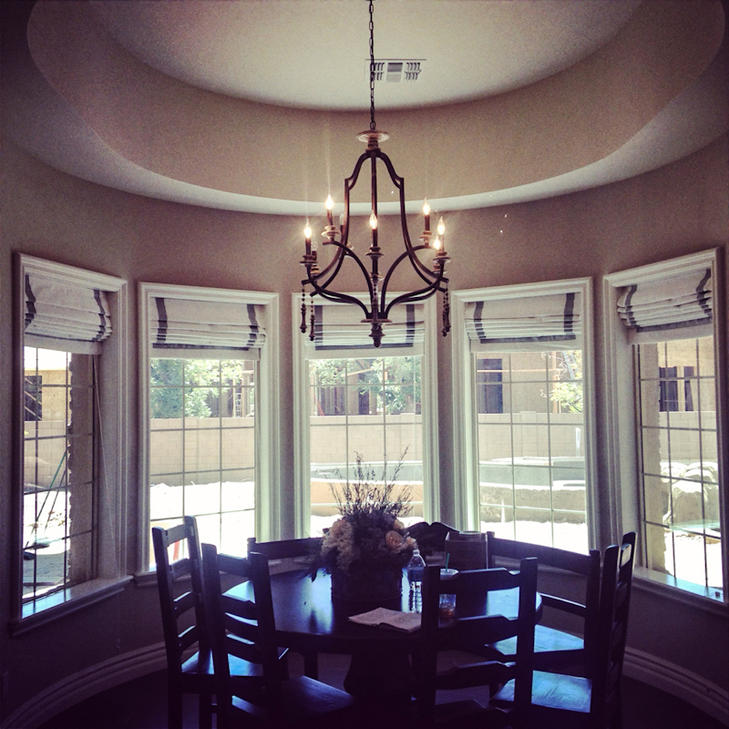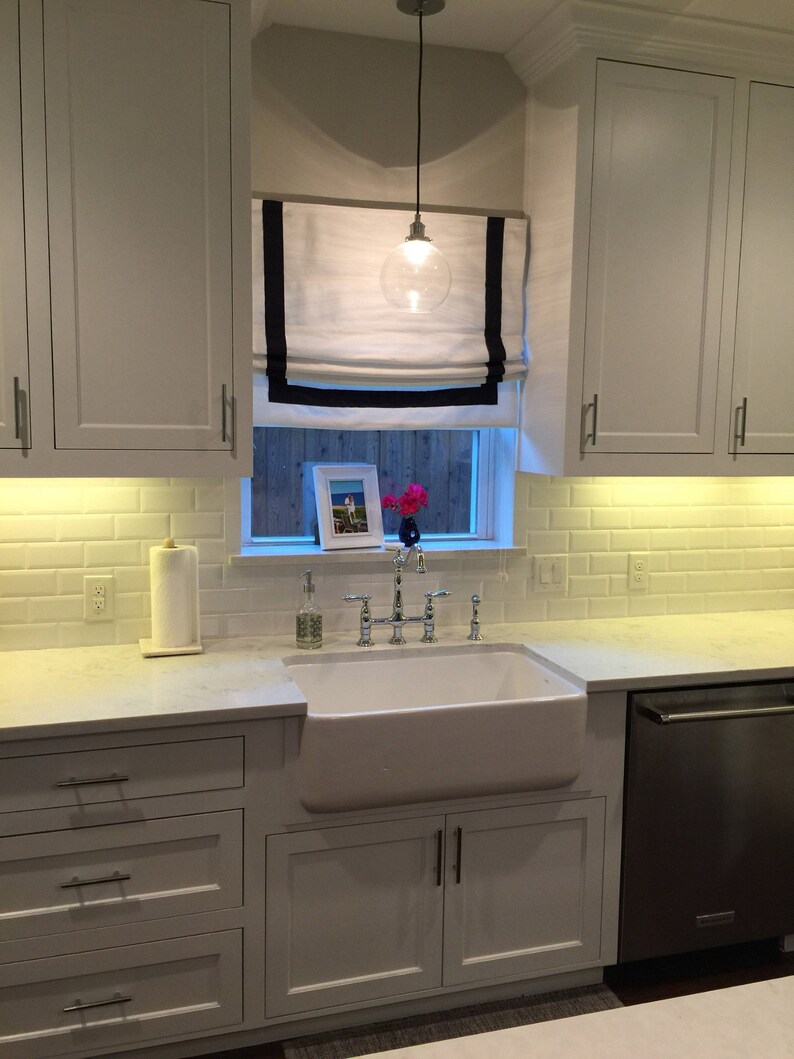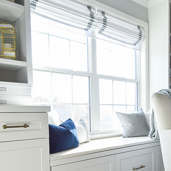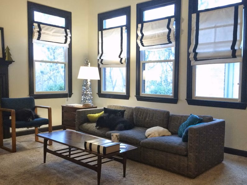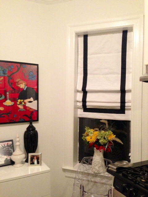 A ribbon trim Roman shade has a wide band of ribbon inset, bordering the shade. The base fabric for shade is white 7 oz. cotton duck with 2 1/4 inch wide grosgrain ribbon color of customer’s choice. If you prefer a different base color you can select a different color here: 7 oz Duck ($17/yd) — Textiles by Melissa. Please message me with your change.